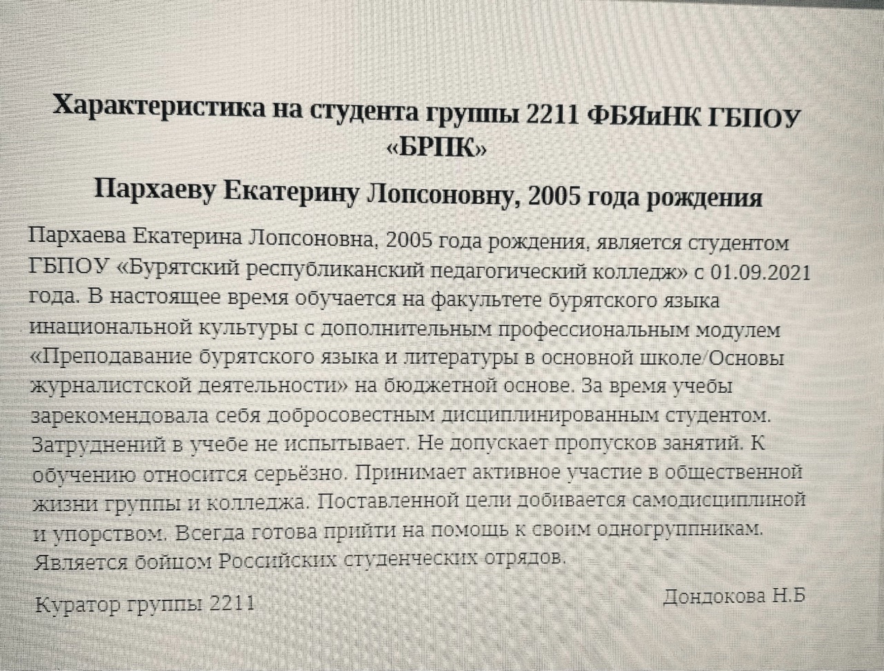 ФИО: Пархаева Екатерина Лопсоновна